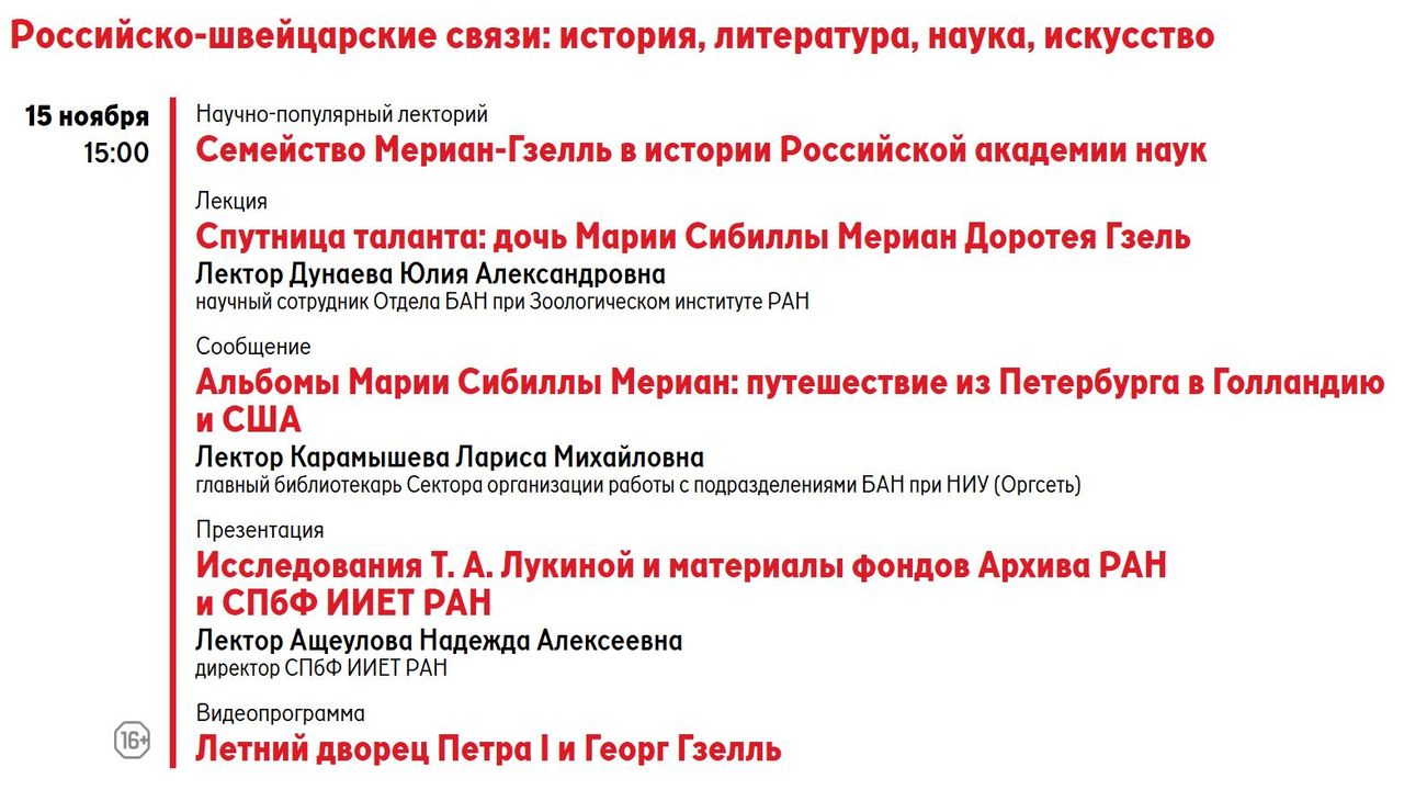 Научно-популярное мероприятие «СЕМЕЙСТВО МЕРИАН-ГЗЕЛЛЬ В ИСТОРИИ РОССИЙСКОЙ АКАДЕМИИ НАУК» (в рамках XII Фестиваля кино Швейцарии в Санкт-Петербурге) прошло 15 ноября 2025 года в конференц-зале СПбФ ИИЕТ РАН.