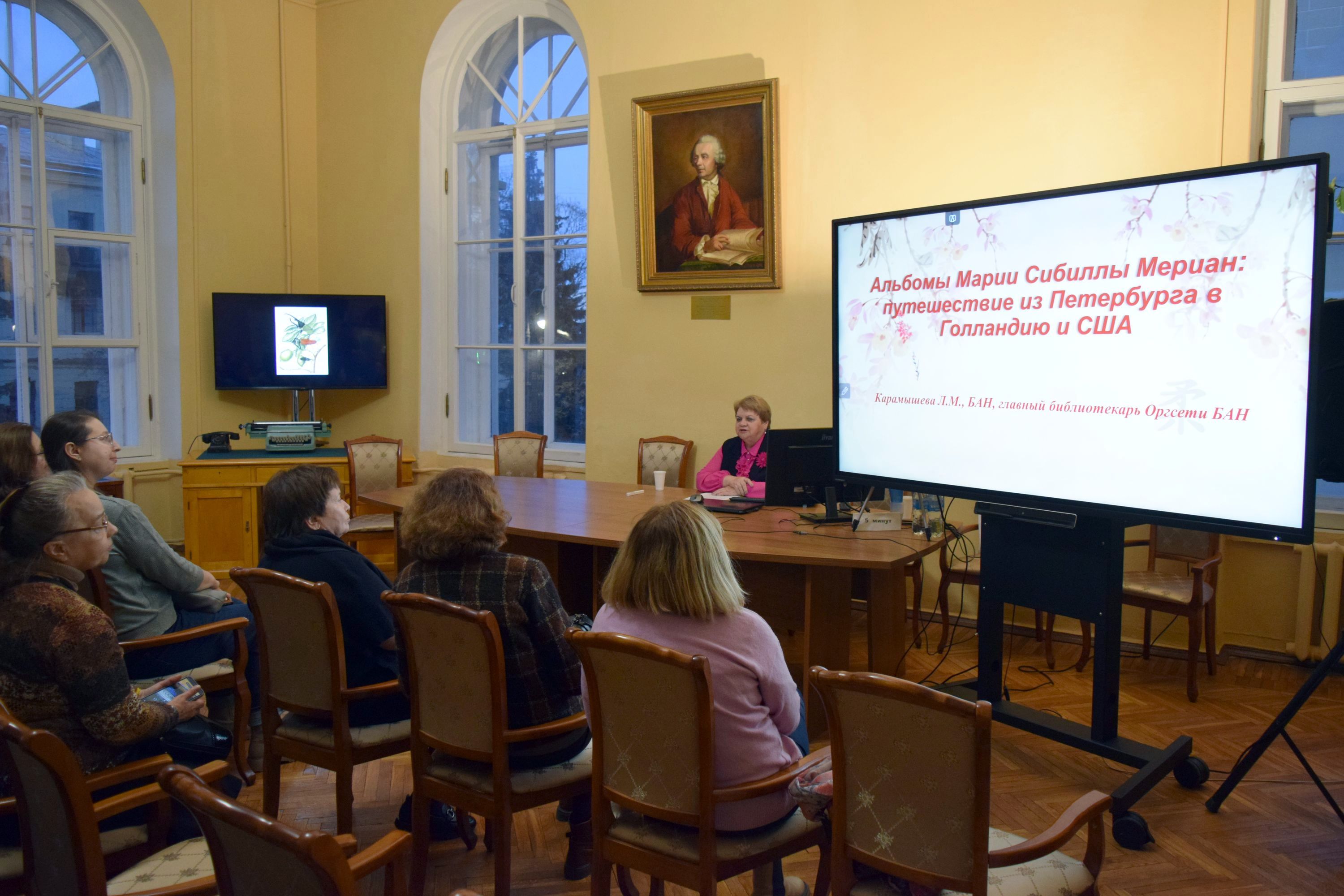 Карамышева Лариса Михайловна, главный библиотекарь Сектора организации работы с подразделениями БАН при НИУ (Оргсеть), рассказала о выездных выставках альбомов Марии Сибиллы Мериан в Голландии и США.