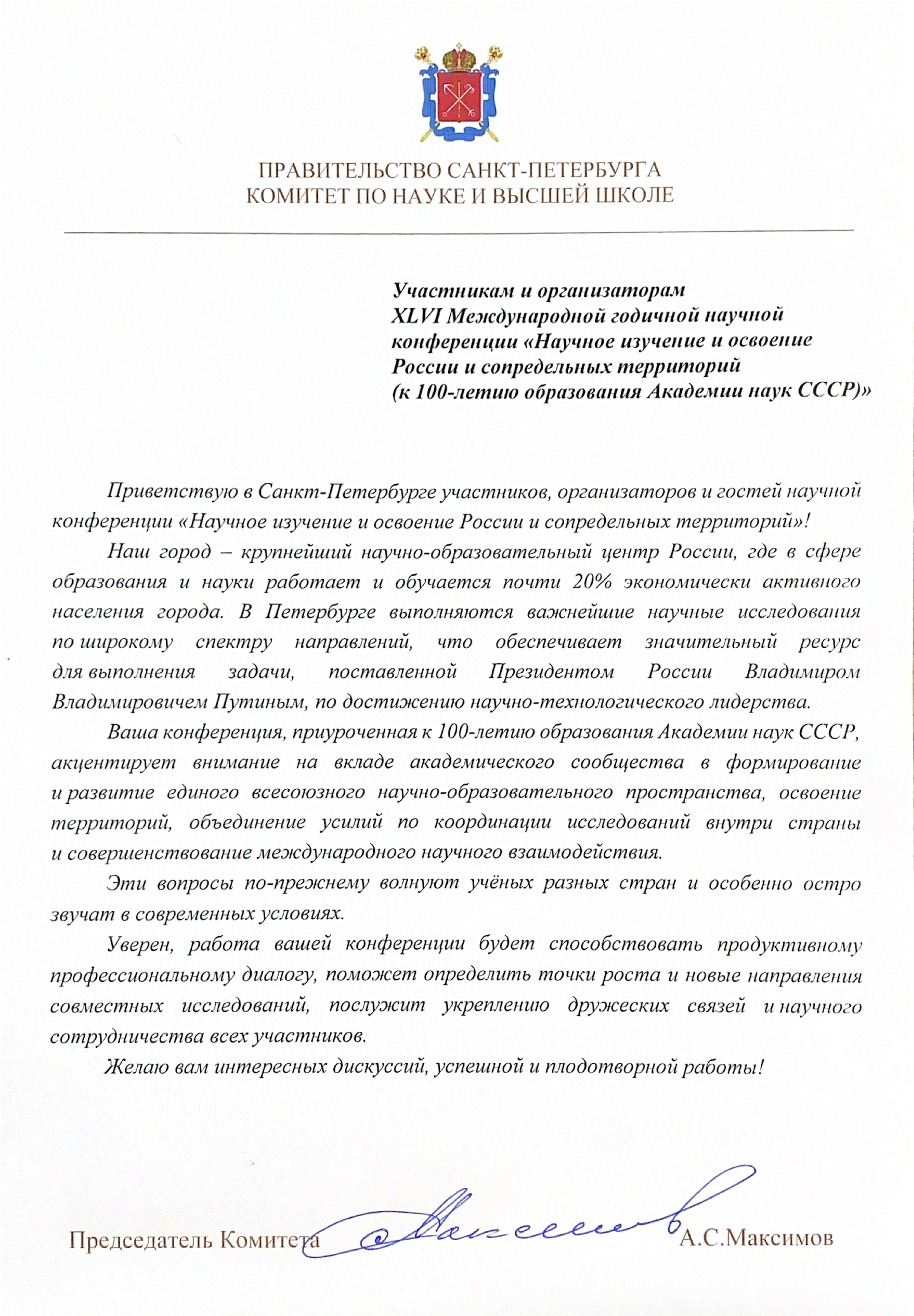 Приветствие Комитета по науке и высшей школе Правительства Санкт- Петербурга – председатель Комитета Андрей Станиславович Максимов (Приветствие зачитывает директор СПбФ ИИЕТ РАН, к.соц.н. Надежда Алексеевна Ащеулова)