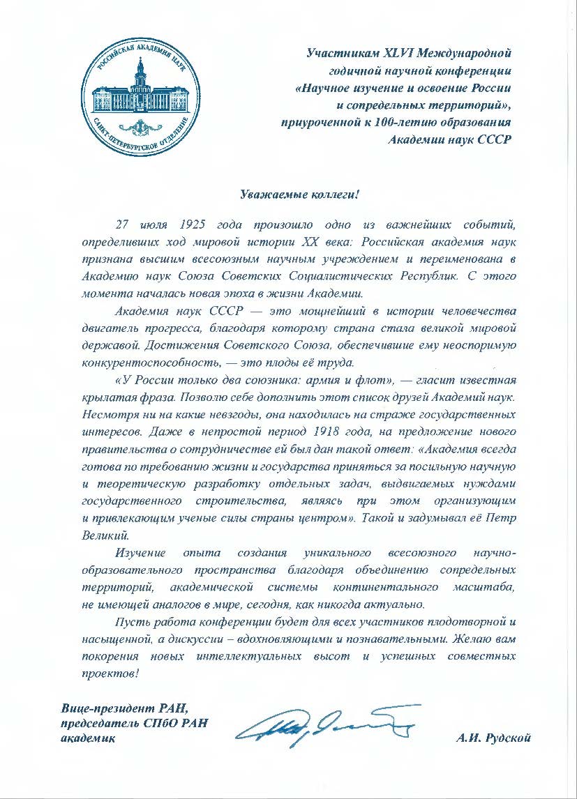 Приветствие Санкт-Петербургского отделения Российской академии наук – председатель Отделения, академик РАН Андрей Иванович Рудской. (Приветствие зачитывает начальник Отдела научных мероприятий СПбО РАН Евгений Николаевич Демин)