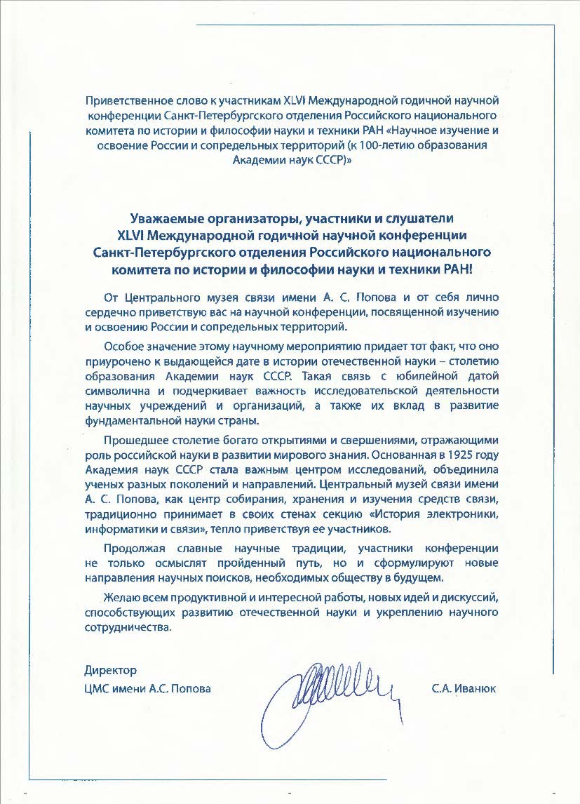 Приветствие Центрального музея связи имени А.С. Попова – директор, к.ист.н., член Правления Российского исторического общества Сергей Александрович Иванюк